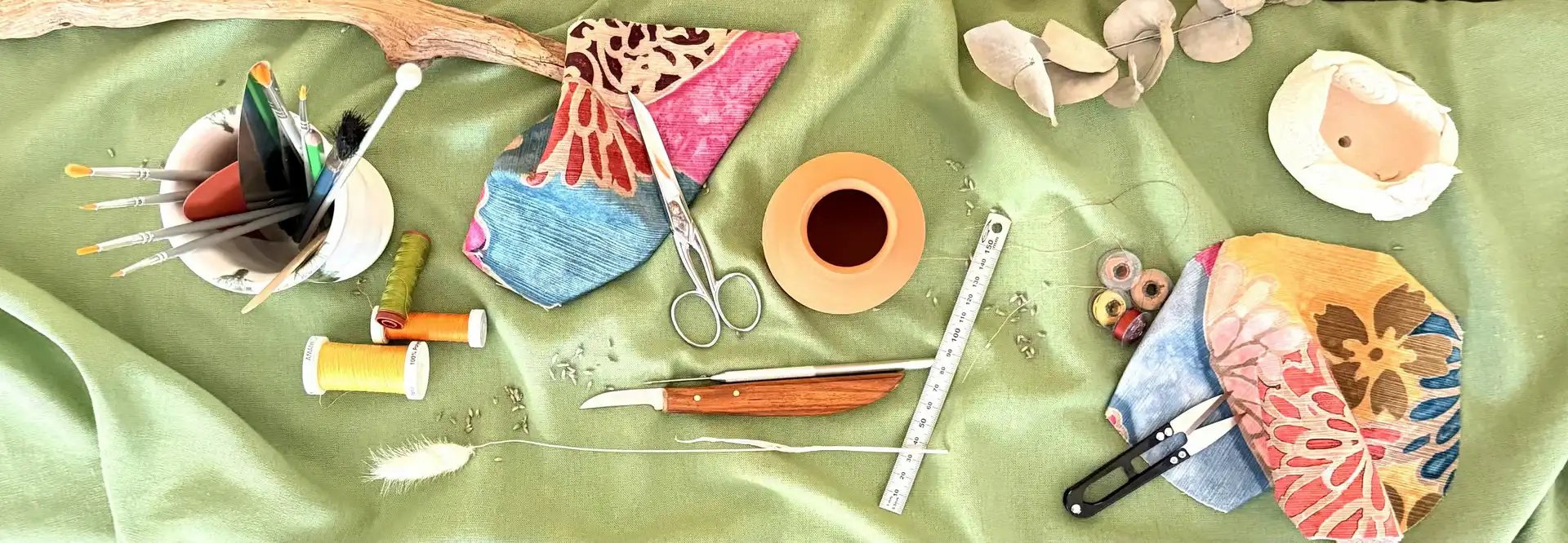 Mon atelier est un espace lumineux et accueillant. Tissus, fils, aiguilles, terre, pinceaux et outils y sont rangés avec soin. Couleurs, matières et textures se côtoient harmonieusement, prêtes à être utilisées pour donner vie à des pièces artisanales uniques.